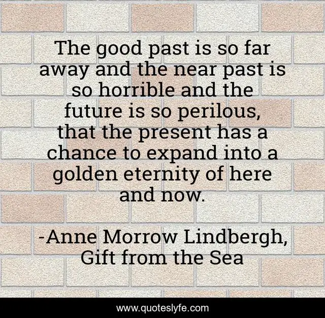 This page presents the quote "The good past is so far away and the near past is so horrible and the future is so perilous, that the present has a chance to expand into a golden eternity of here and now.". Author of this quote is Anne Morrow Lindbergh, Gift from the Sea. This quote is about eternity, past, future,.