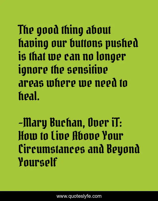 This page presents the quote "The good thing about having our buttons pushed is that we can no longer ignore the sensitive areas where we need to heal.". Author of this quote is Mary Buchan, Over iT: How to Live Above Your Circumstances and Beyond Yourself. This quote is about buttons, sensitive, heal, book, over-indulgence,.