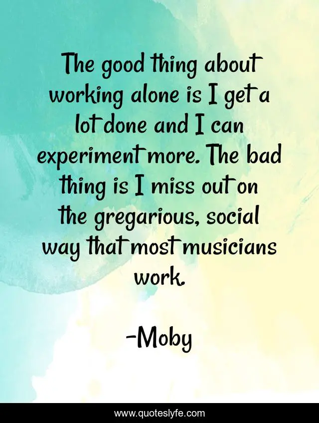 This page presents the quote "The good thing about working alone is I get a lot done and I can experiment more. The bad thing is I miss out on the gregarious, social way that most musicians work.". Author of this quote is Moby. This quote is about work, good, musicians,.