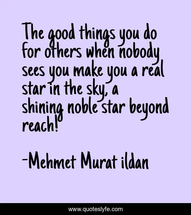 This page presents the quote "The good things you do for others when nobody sees you make you a real star in the sky, a shining noble star beyond reach!". Author of this quote is Mehmet Murat ildan. This quote is about turkish-aphorisms, noble, mehmet-murat-ildan, ildan-wise-sayings, doing-good, ildan-wisdom, doing-good-for-the-world, turkish, turkish-playwrights,.