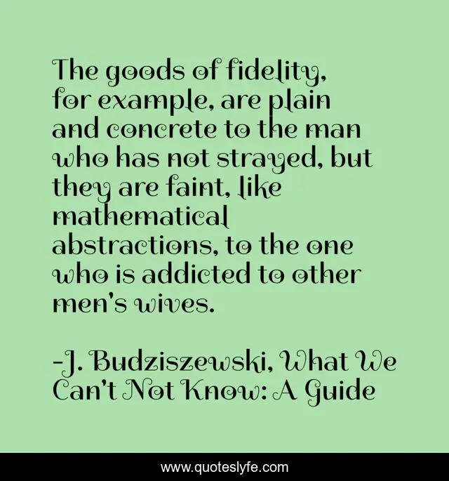 This page presents the quote "The goods of fidelity, for example, are plain and concrete to the man who has not strayed, but they are faint, like mathematical abstractions, to the one who is addicted to other men's wives.". Author of this quote is J. Budziszewski, What We Can't Not Know: A Guide. This quote is about fidelity, adultery, morals, morality,.