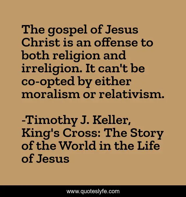 This page presents the quote "The gospel of Jesus Christ is an offense to both religion and irreligion. It can't be co-opted by either moralism or relativism.". Author of this quote is Timothy J. Keller, King's Cross: The Story of the World in the Life of Jesus. This quote is about religion, gospel, christ, jesus,.