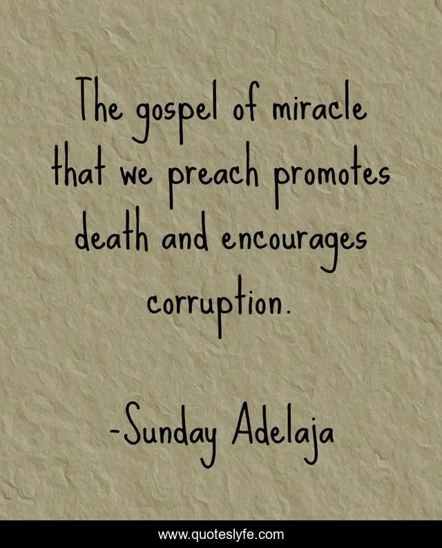 This page presents the quote "The gospel of miracle that we preach promotes death and encourages corruption.". Author of this quote is Sunday Adelaja. This quote is about death, encouragement, miracle, preaching, gospel, corruption,.