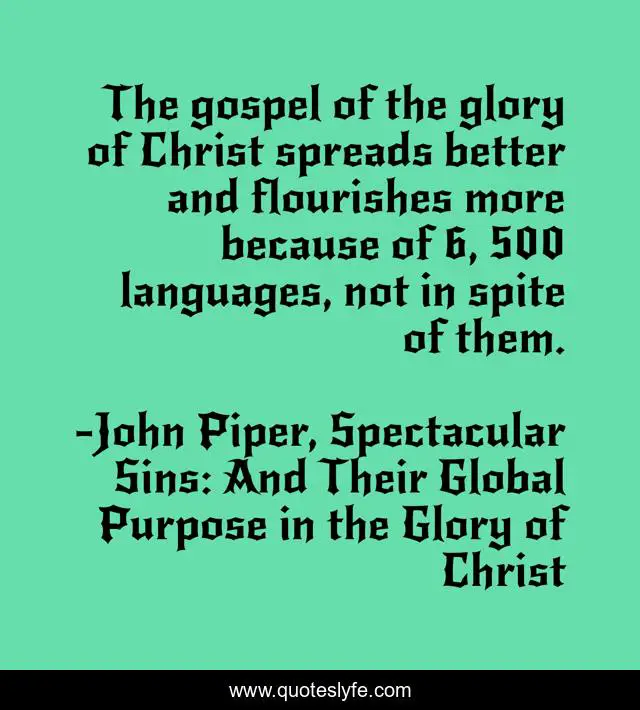 This page presents the quote "The gospel of the glory of Christ spreads better and flourishes more because of 6, 500 languages, not in spite of them.". Author of this quote is John Piper, Spectacular Sins: And Their Global Purpose in the Glory of Christ. This quote is about languages, gospel,.