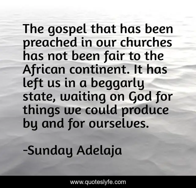 This page presents the quote "The gospel that has been preached in our churches has not been fair to the African continent. It has left us in a beggarly state, waiting on God for things we could produce by and for ourselves.". Author of this quote is Sunday Adelaja. This quote is about gospel, produce, church,.