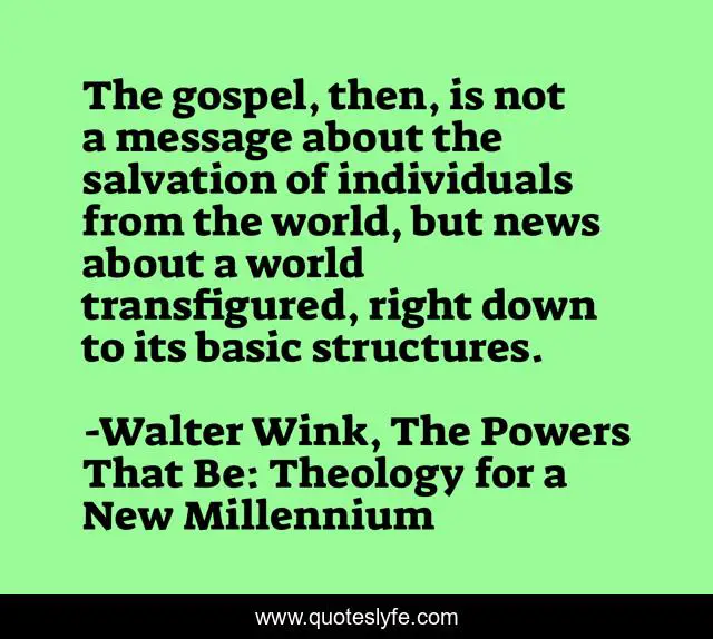 This page presents the quote "The gospel, then, is not a message about the salvation of individuals from the world, but news about a world transfigured, right down to its basic structures.". Author of this quote is Walter Wink, The Powers That Be: Theology for a New Millennium. This quote is about gospel, salvation, transformation,.