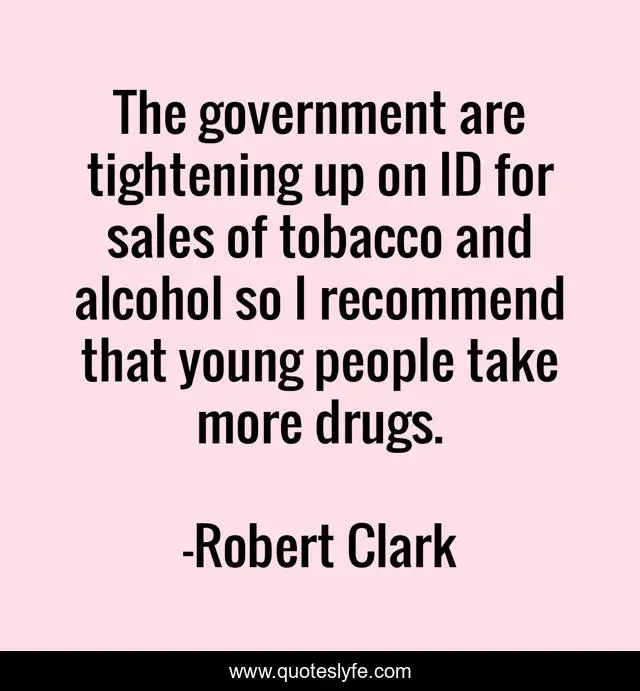 This page presents the quote "The government are tightening up on ID for sales of tobacco and alcohol so I recommend that young people take more drugs.". Author of this quote is Robert Clark. This quote is about drugs, humour, laws,.