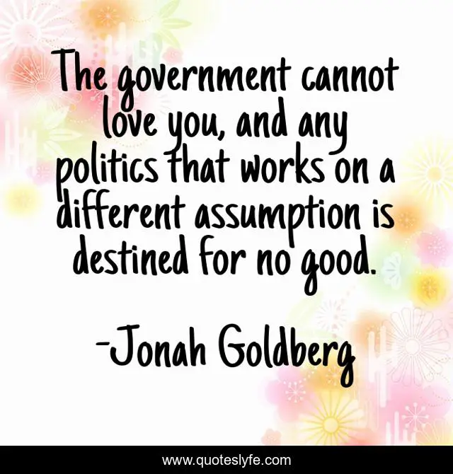 This page presents the quote "The government cannot love you, and any politics that works on a different assumption is destined for no good.". Author of this quote is Jonah Goldberg. This quote is about politics, government, liberal, jonah-goldberg, fascism,.