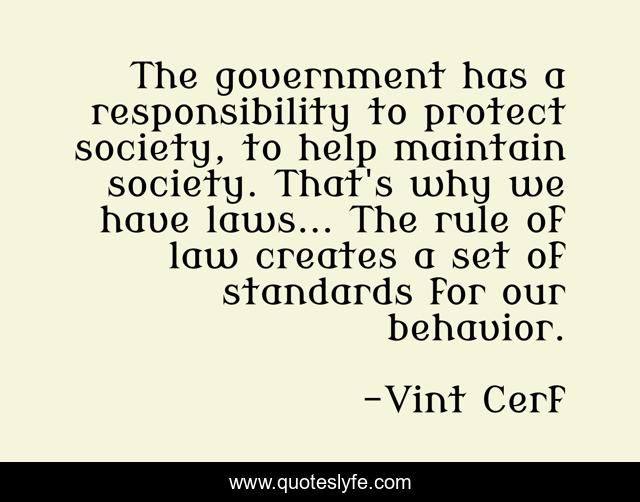 This page presents the quote "The government has a responsibility to protect society, to help maintain society. That's why we have laws... The rule of law creates a set of standards for our behavior.". Author of this quote is Vint Cerf. This quote is about society, law, responsibility,.