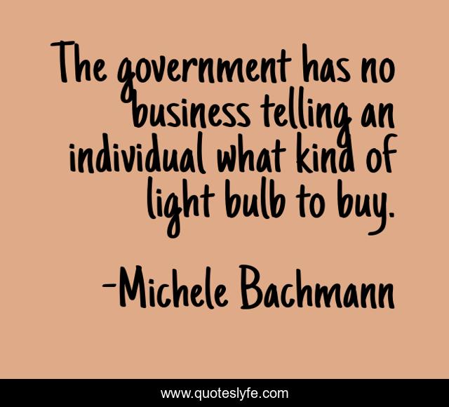 This page presents the quote "The government has no business telling an individual what kind of light bulb to buy.". Author of this quote is Michele Bachmann. This quote is about light, kind, business,.