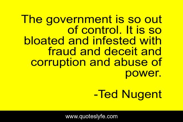This page presents the quote "The government is so out of control. It is so bloated and infested with fraud and deceit and corruption and abuse of power.". Author of this quote is Ted Nugent. This quote is about control, government,.
