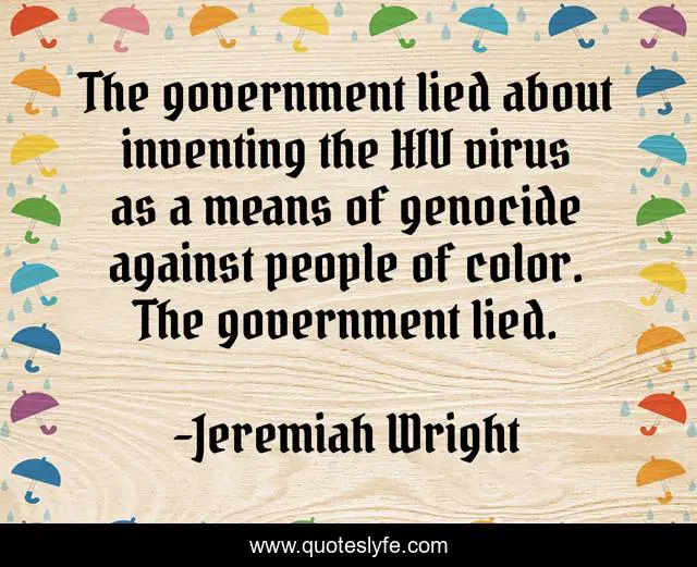 This page presents the quote "The government lied about inventing the HIV virus as a means of genocide against people of color. The government lied.". Author of this quote is Jeremiah Wright. This quote is about color, virus, people,.