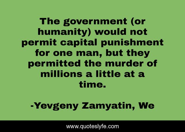 This page presents the quote "The government (or humanity) would not permit capital punishment for one man, but they permitted the murder of millions a little at a time.". Author of this quote is Yevgeny Zamyatin, We. This quote is about death, murder, capital-punishment, humanity, government,.