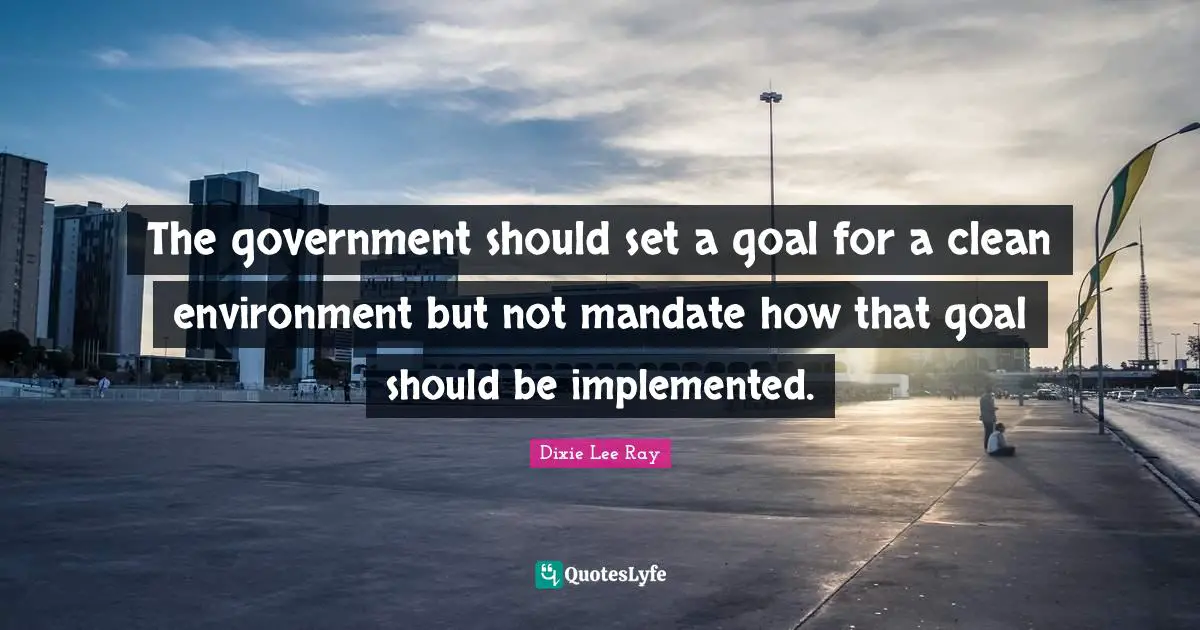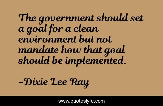 This page presents the quote "The government should set a goal for a clean environment but not mandate how that goal should be implemented.". Author of this quote is Dixie Lee Ray. This quote is about environmental, goal,.