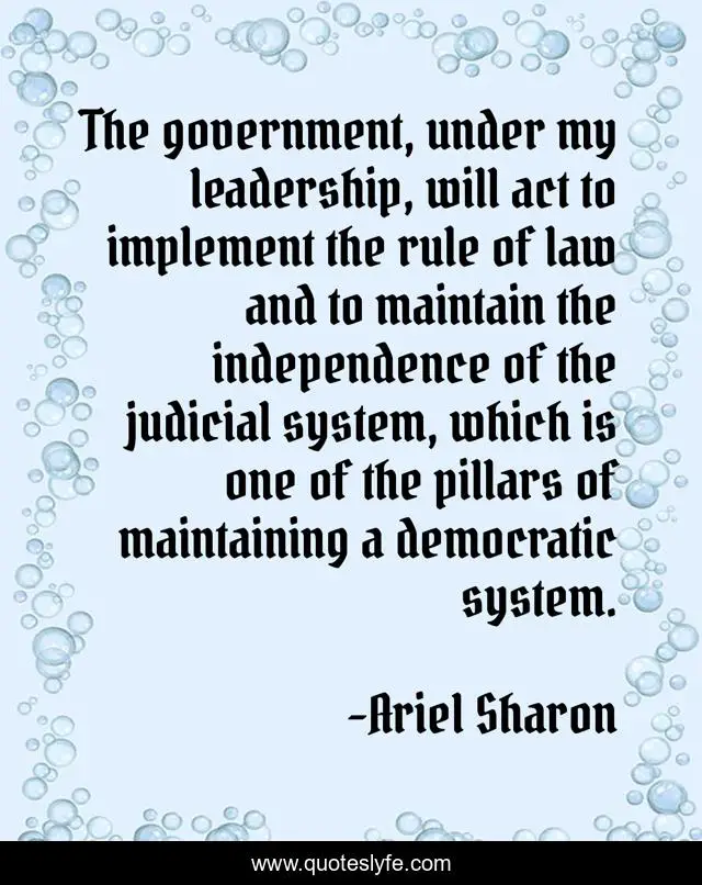 This page presents the quote "The government, under my leadership, will act to implement the rule of law and to maintain the independence of the judicial system, which is one of the pillars of maintaining a democratic system.". Author of this quote is Ariel Sharon. This quote is about leadership, law, government,.