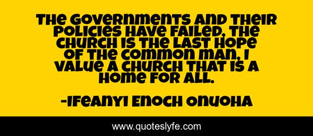 This page presents the quote "The governments and their policies have failed, the church is the last hope of the common man, I value a church that is a home for all.". Author of this quote is Ifeanyi Enoch Onuoha. This quote is about church, government,.