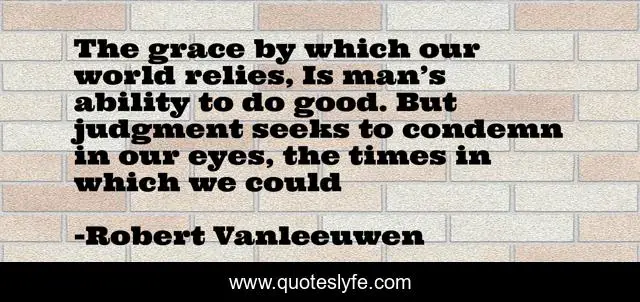 This page presents the quote "The grace by which our world relies, Is man’s ability to do good. But judgment seeks to condemn in our eyes, the times in which we could". Author of this quote is Robert Vanleeuwen. This quote is about life, motivation, reality, truth, understanding, hope,.