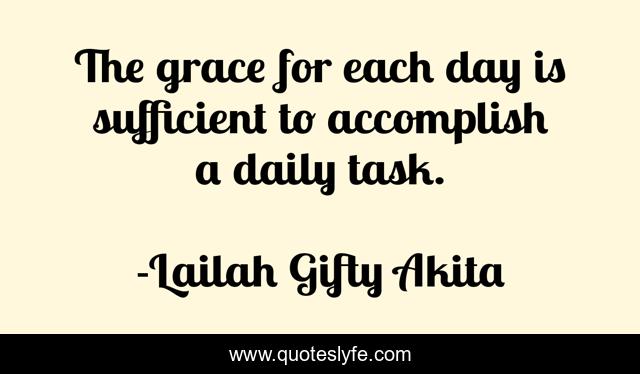 This page presents the quote "The grace for each day is sufficient to accomplish a daily task.". Author of this quote is Lailah Gifty Akita. This quote is about daily-task, task, grace-of-god, tasks, task-of-a-poet, grace-and-favor, grace,.
