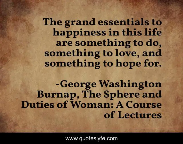 This page presents the quote "The grand essentials to happiness in this life are something to do, something to love, and something to hope for.". Author of this quote is George Washington Burnap, The Sphere and Duties of Woman: A Course of Lectures. This quote is about misattributed-to-chalmers, misattributed-to-joseph-addison, misattributed-tom-bodett, widely-misattributed, misattributed-to-kant, inspirational, enthusiasm, happiness,.