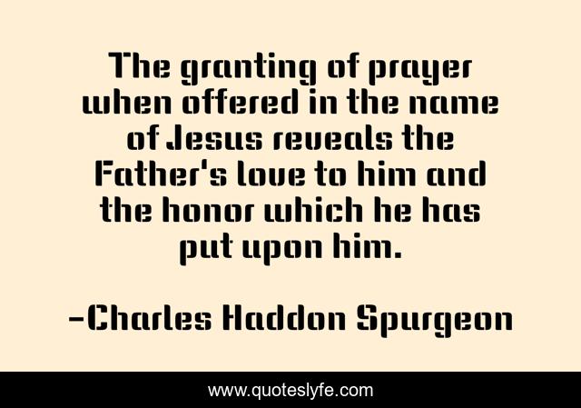 This page presents the quote "The granting of prayer when offered in the name of Jesus reveals the Father's love to him and the honor which he has put upon him.". Author of this quote is Charles Haddon Spurgeon. .