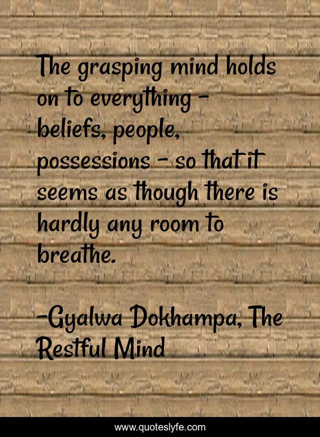 This page presents the quote "The grasping mind holds on to everything – beliefs, people, possessions – so that it seems as though there is hardly any room to breathe.". Author of this quote is Gyalwa Dokhampa, The Restful Mind. This quote is about possession, grasping-mind, beliefs,.
