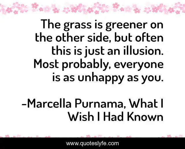 This page presents the quote "The grass is greener on the other side, but often this is just an illusion. Most probably, everyone is as unhappy as you.". Author of this quote is Marcella Purnama, What I Wish I Had Known. This quote is about life, life-lessons, wisdom,.