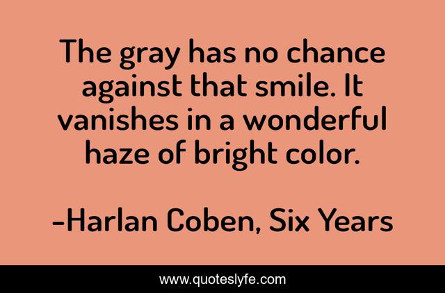 This page presents the quote "The gray has no chance against that smile. It vanishes in a wonderful haze of bright color.". Author of this quote is Harlan Coben, Six Years. This quote is about smile, happiness,.