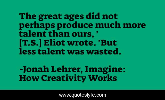 This page presents the quote "The great ages did not perhaps produce much more talent than ours, ' [T.S.] Eliot wrote. 'But less talent was wasted.". Author of this quote is Jonah Lehrer, Imagine: How Creativity Works. This quote is about 227, creativity, elizabethan, london, talent,.