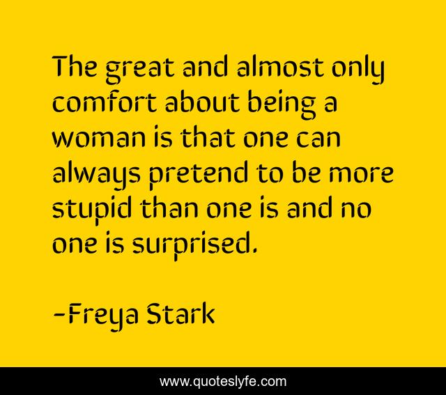 This page presents the quote "The great and almost only comfort about being a woman is that one can always pretend to be more stupid than one is and no one is surprised.". Author of this quote is Freya Stark. .