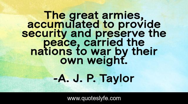 This page presents the quote "The great armies, accumulated to provide security and preserve the peace, carried the nations to war by their own weight.". Author of this quote is A. J. P. Taylor. This quote is about great, security, war,.