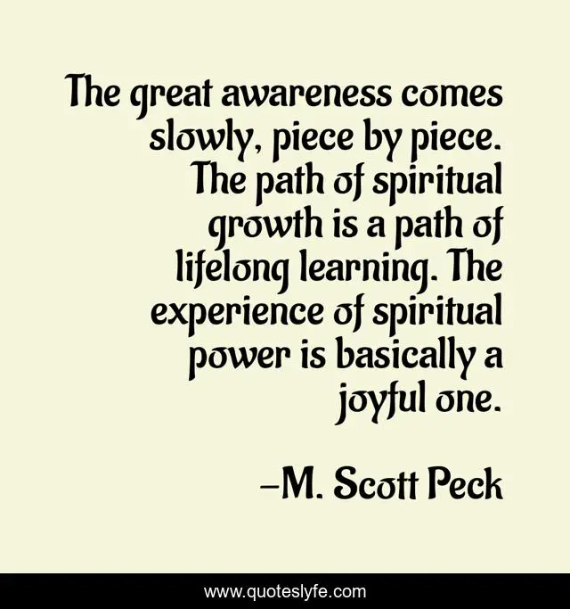 This page presents the quote "The great awareness comes slowly, piece by piece. The path of spiritual growth is a path of lifelong learning. The experience of spiritual power is basically a joyful one.". Author of this quote is M. Scott Peck. This quote is about great, experience, power,.