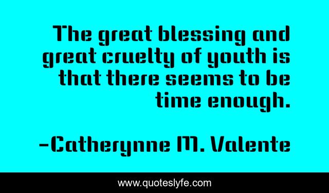 This page presents the quote "The great blessing and great cruelty of youth is that there seems to be time enough.". Author of this quote is Catherynne M. Valente. .