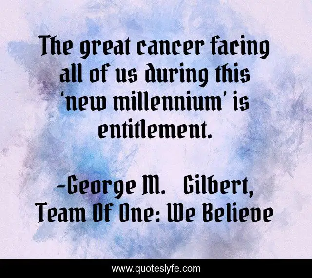 This page presents the quote "The great cancer facing all of us during this ‘new millennium’ is entitlement.". Author of this quote is George M. Gilbert, Team Of One: We Believe. This quote is about team-direction, confidence, football, success, positive, motivational, winning, coaching, optimistic,.