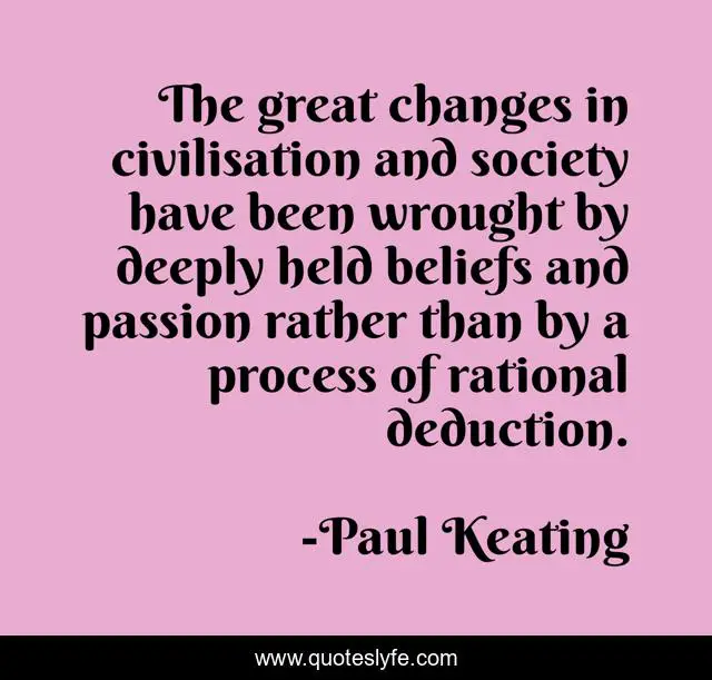 This page presents the quote "The great changes in civilisation and society have been wrought by deeply held beliefs and passion rather than by a process of rational deduction.". Author of this quote is Paul Keating. This quote is about passion, great, changes,.