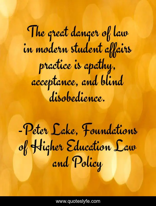 This page presents the quote "The great danger of law in modern student affairs practice is apathy, acceptance, and blind disobedience.". Author of this quote is Peter Lake, Foundations of Higher Education Law and Policy. This quote is about law, higher-educat,.
