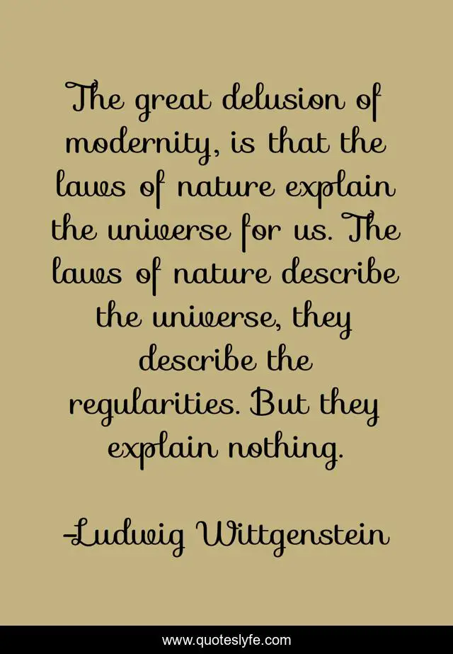 This page presents the quote "The great delusion of modernity, is that the laws of nature explain the universe for us. The laws of nature describe the universe, they describe the regularities. But they explain nothing.". Author of this quote is Ludwig Wittgenstein. This quote is about explanation-of-universe, universe, delusion-of-modernity, laws-of-nature,.