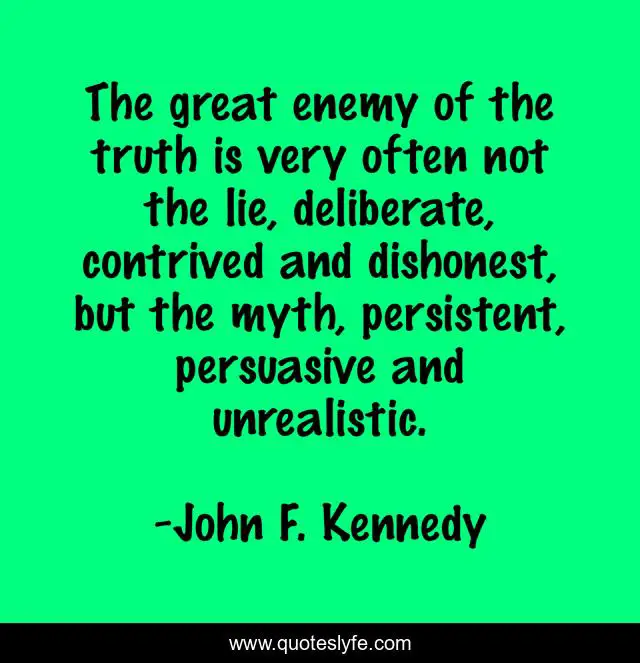 This page presents the quote "The great enemy of the truth is very often not the lie, deliberate, contrived and dishonest, but the myth, persistent, persuasive and unrealistic.". Author of this quote is John F. Kennedy. This quote is about lie, great, truth is,.