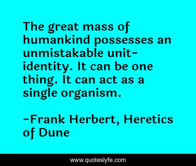This page presents the quote "The great mass of humankind possesses an unmistakable unit-identity. It can be one thing. It can act as a single organism.". Author of this quote is Frank Herbert, Heretics of Dune. This quote is about zeitgeist, collectivism, belief, science-fiction, group-psychology, mythology, messiah,.