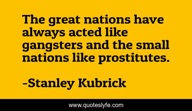 This page presents the quote "The great nations have always acted like gangsters and the small nations like prostitutes.". Author of this quote is Stanley Kubrick. .