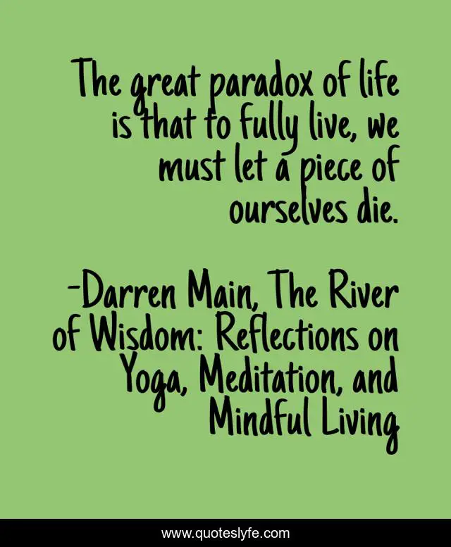 This page presents the quote "The great paradox of life is that to fully live, we must let a piece of ourselves die.". Author of this quote is Darren Main, The River of Wisdom: Reflections on Yoga, Meditation, and Mindful Living. This quote is about meditation, yoga, mindfulness,.