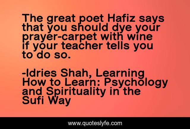 This page presents the quote "The great poet Hafiz says that you should dye your prayer-carpet with wine if your teacher tells you to do so.". Author of this quote is Idries Shah, Learning How to Learn: Psychology and Spirituality in the Sufi Way. This quote is about sufism, sufis, hafiz,.