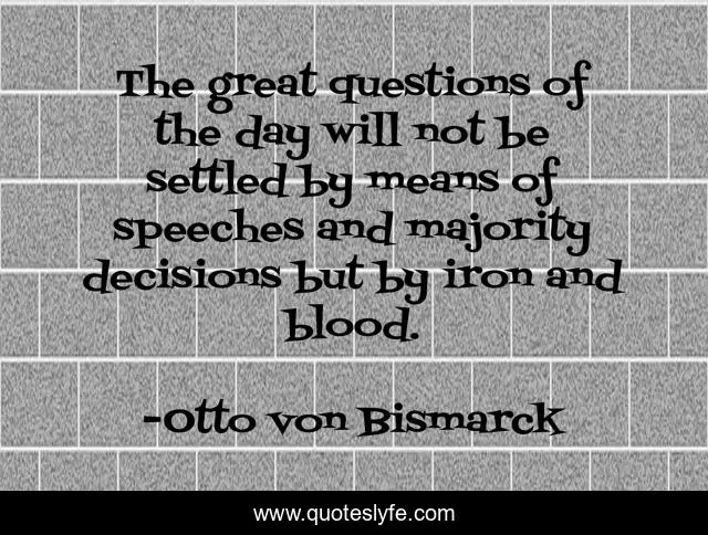 This page presents the quote "The great questions of the day will not be settled by means of speeches and majority decisions but by iron and blood.". Author of this quote is Otto von Bismarck. This quote is about great, decisions, day,.