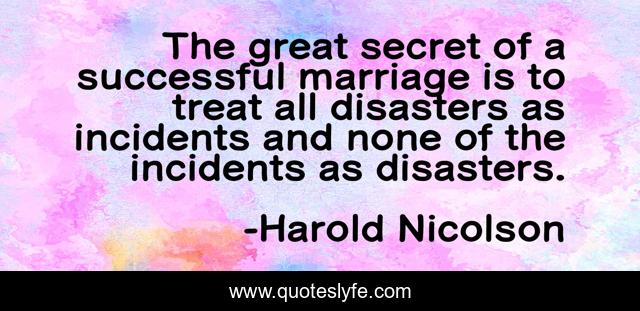 This page presents the quote "The great secret of a successful marriage is to treat all disasters as incidents and none of the incidents as disasters.". Author of this quote is Harold Nicolson. This quote is about love, marriage, affection,.
