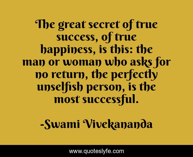 This page presents the quote "The great secret of true success, of true happiness, is this: the man or woman who asks for no return, the perfectly unselfish person, is the most successful.". Author of this quote is Swami Vivekananda. This quote is about etc, religious, hinduism, inspirational, enthusiasm,.
