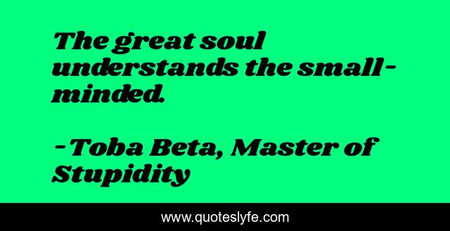 This page presents the quote "The great soul understands the small-minded.". Author of this quote is Toba Beta, Master of Stupidity. This quote is about great-soul, small-minded, understanding,.