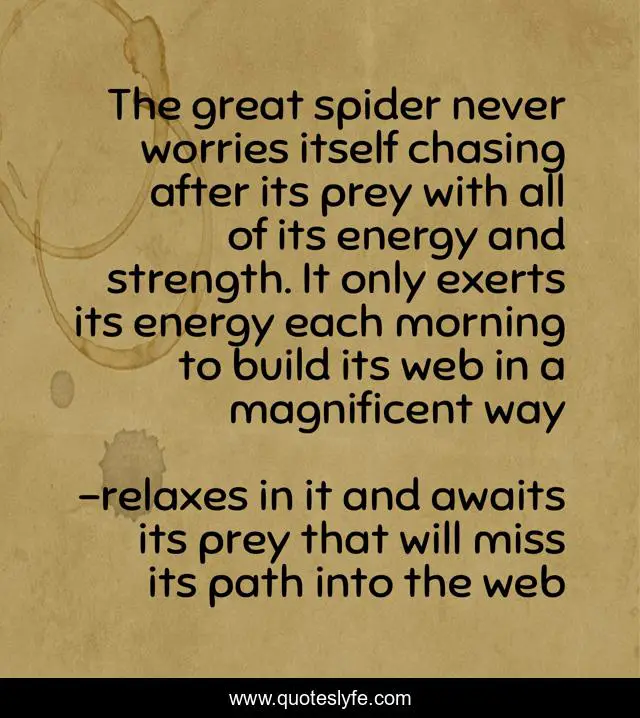 "relaxes in it and awaits its prey that will miss its path into the web Quotes." Quoteslyfe.com, 2025. Fri. 05 Dec. 2025. <https://www.quoteslyfe.com/quote/The-great-spider-never-worries-itself-chasing-227578>.