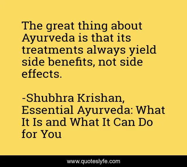 This page presents the quote "The great thing about Ayurveda is that its treatments always yield side benefits, not side effects.". Author of this quote is Shubhra Krishan, Essential Ayurveda: What It Is and What It Can Do for You. This quote is about being, food, health, india, ayurveda,.