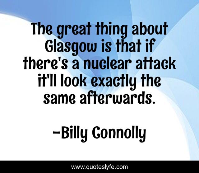 This page presents the quote "The great thing about Glasgow is that if there's a nuclear attack it'll look exactly the same afterwards.". Author of this quote is Billy Connolly. This quote is about attack, look, same,.
