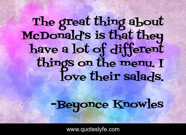 This page presents the quote "The great thing about McDonald's is that they have a lot of different things on the menu. I love their salads.". Author of this quote is Beyonce Knowles. This quote is about menu, different, love, affection,.