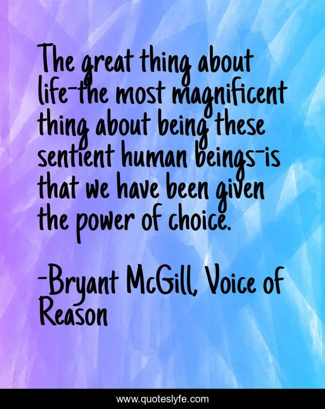 This page presents the quote "The great thing about life-the most magnificent thing about being these sentient human beings-is that we have been given the power of choice.". Author of this quote is Bryant McGill, Voice of Reason. This quote is about human-being, life-experience, power-of-choice,.